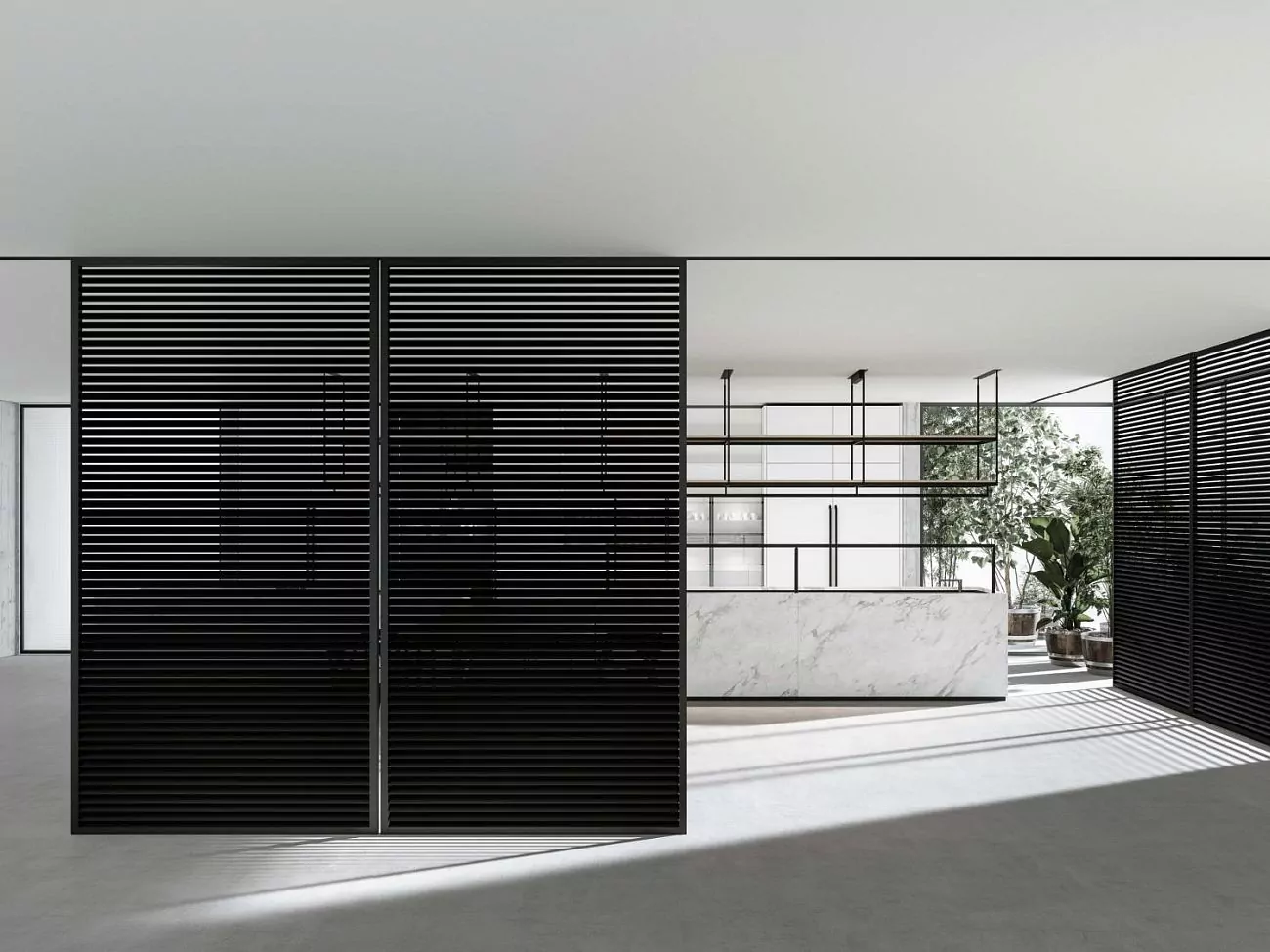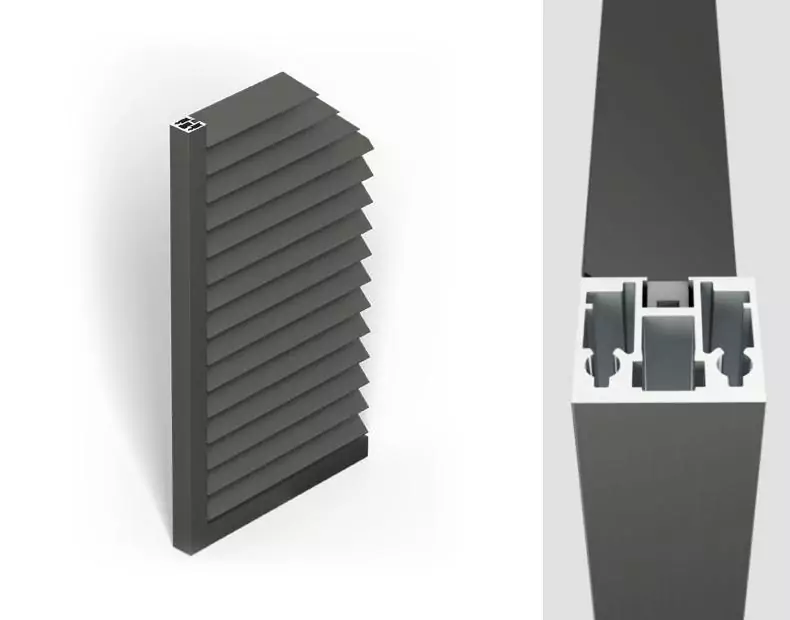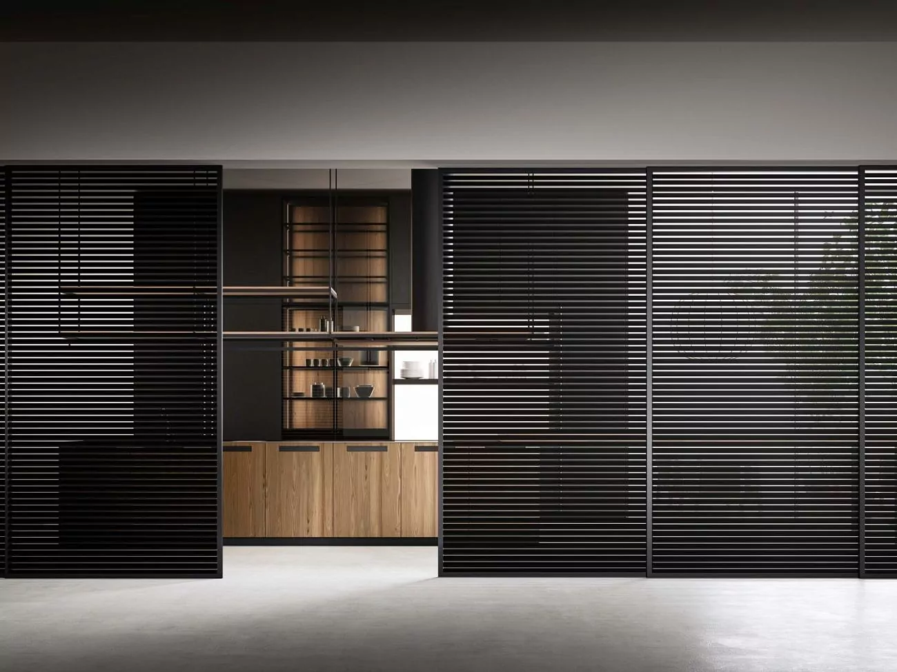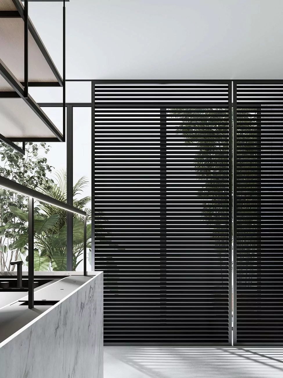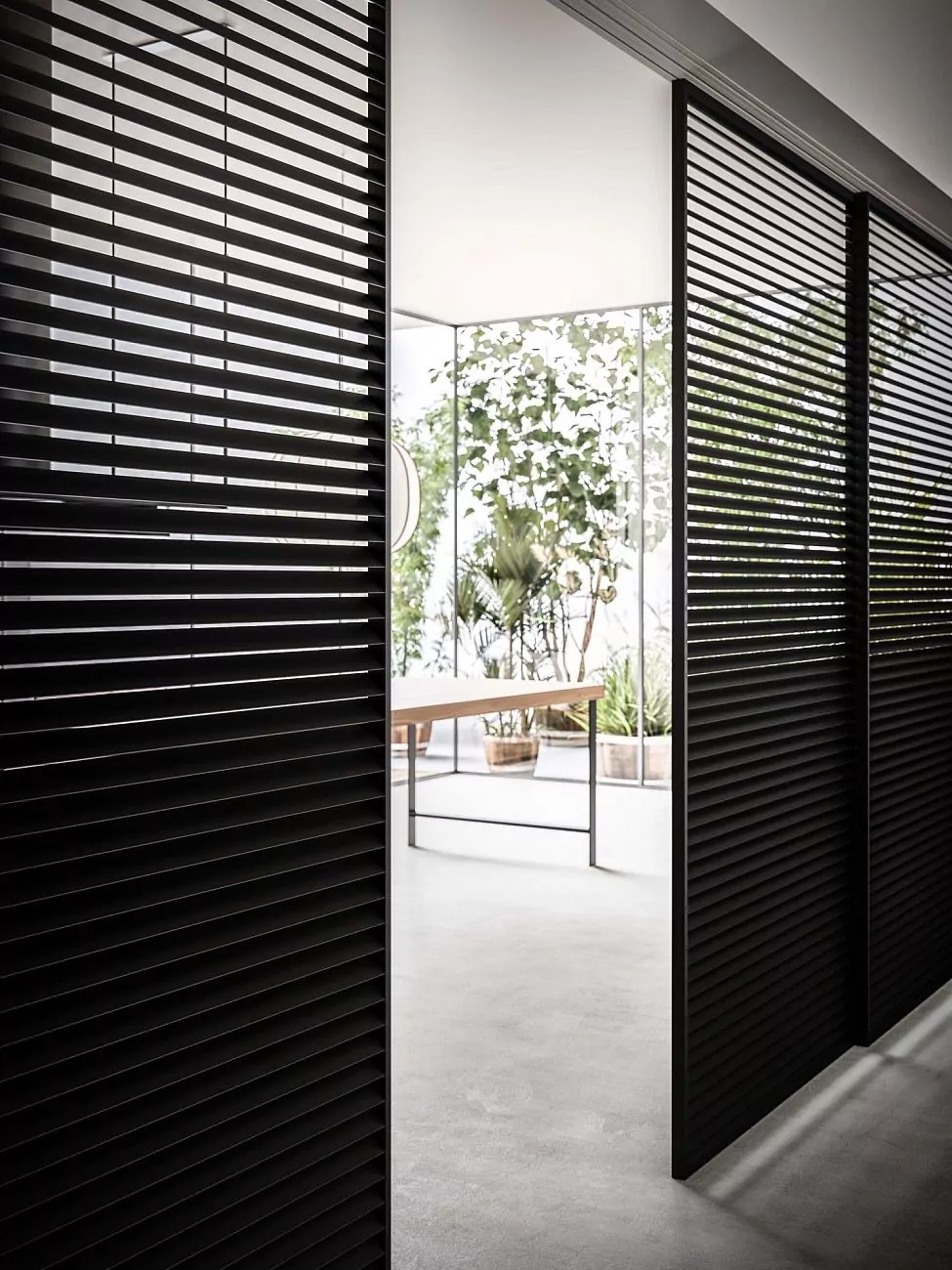Перегородки коллекции Levante – это фильтр, который в состоянии регулировать свет и видимость как снаружи, так и внутри жилого помещения. Полотна выполнены из наклонных элементов треугольного сечения, спроектированных так, чтобы пропускать солнечный свет и одновременно ограничивать видимость. Можно выбирать одну из двух эстетических конструкций, Minimal с главной лицевой поверхностью с тонкими реечками и Plus с главной лицевой поверхностью с рейками большей толщины. Благодаря своей конструкции, полностью выполненной из алюминия, Levante – это первая дверь для внутренних помещений, которую можно применять также и на улице в качестве ветрозащитного и солнцезащитного элемента. Рама, идущая по периметру дверного полотна, выполнена из боковых вертикальных и поперечных стоек размером 36×38 мм.
