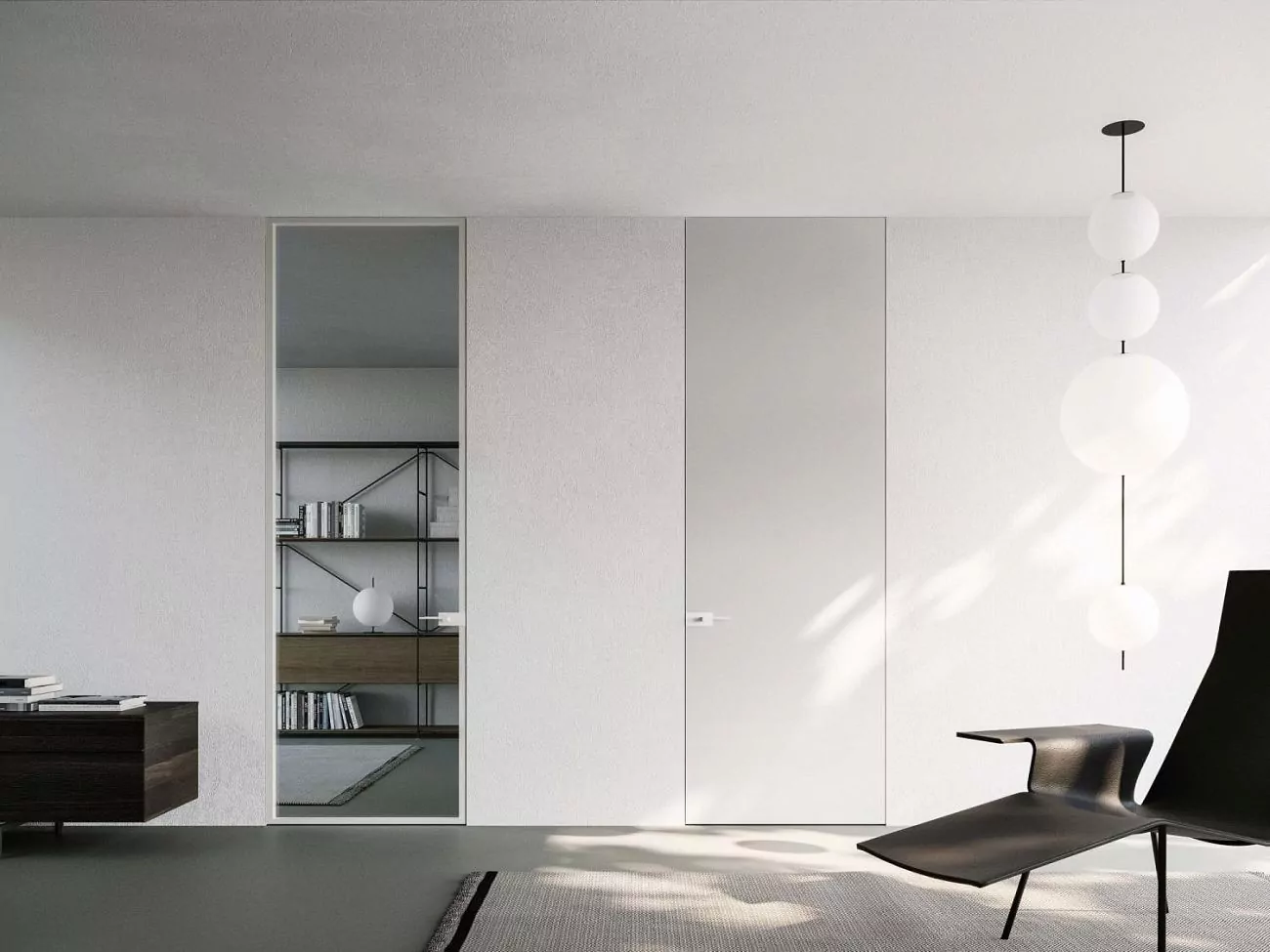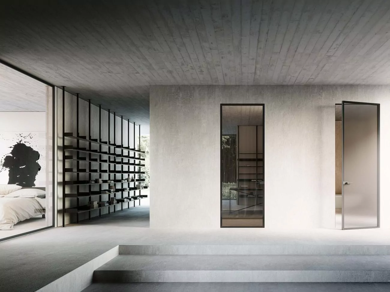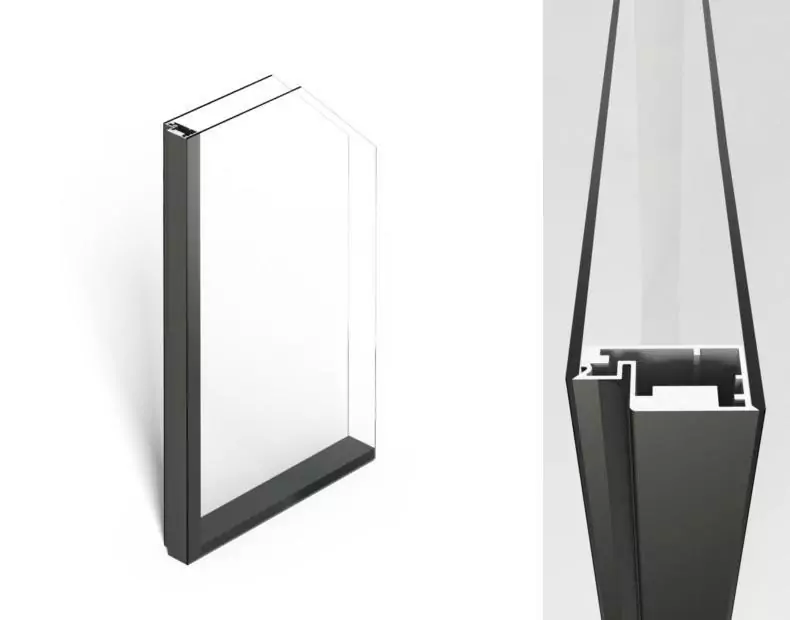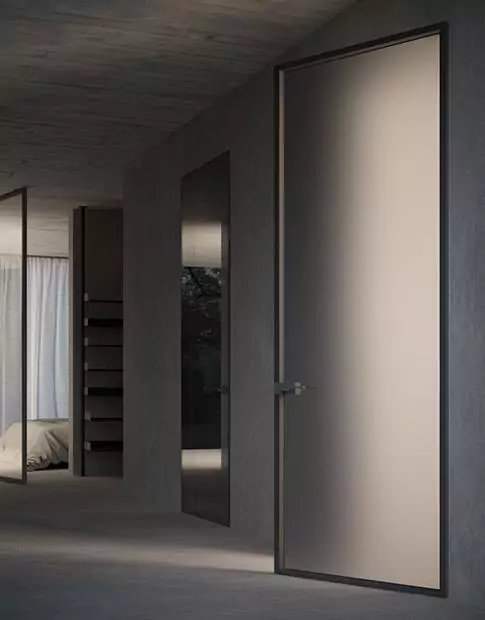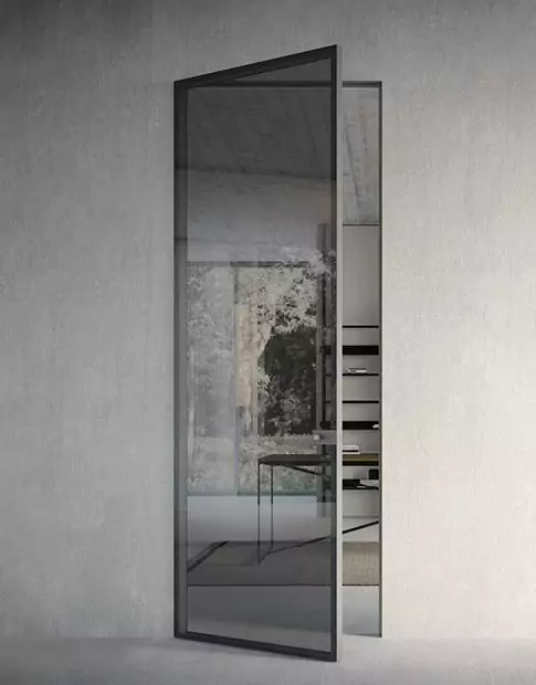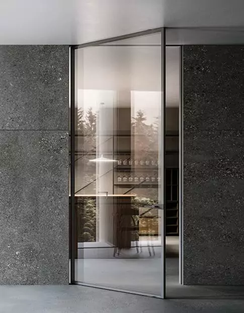 В коллекции Style глубокая алюминиевая рама (60 мм) и два стекла соединены под 45° для идеального краевого прилегания двух материалов. Эта конструктивная особенность придаёт двери монолитный дизайн.